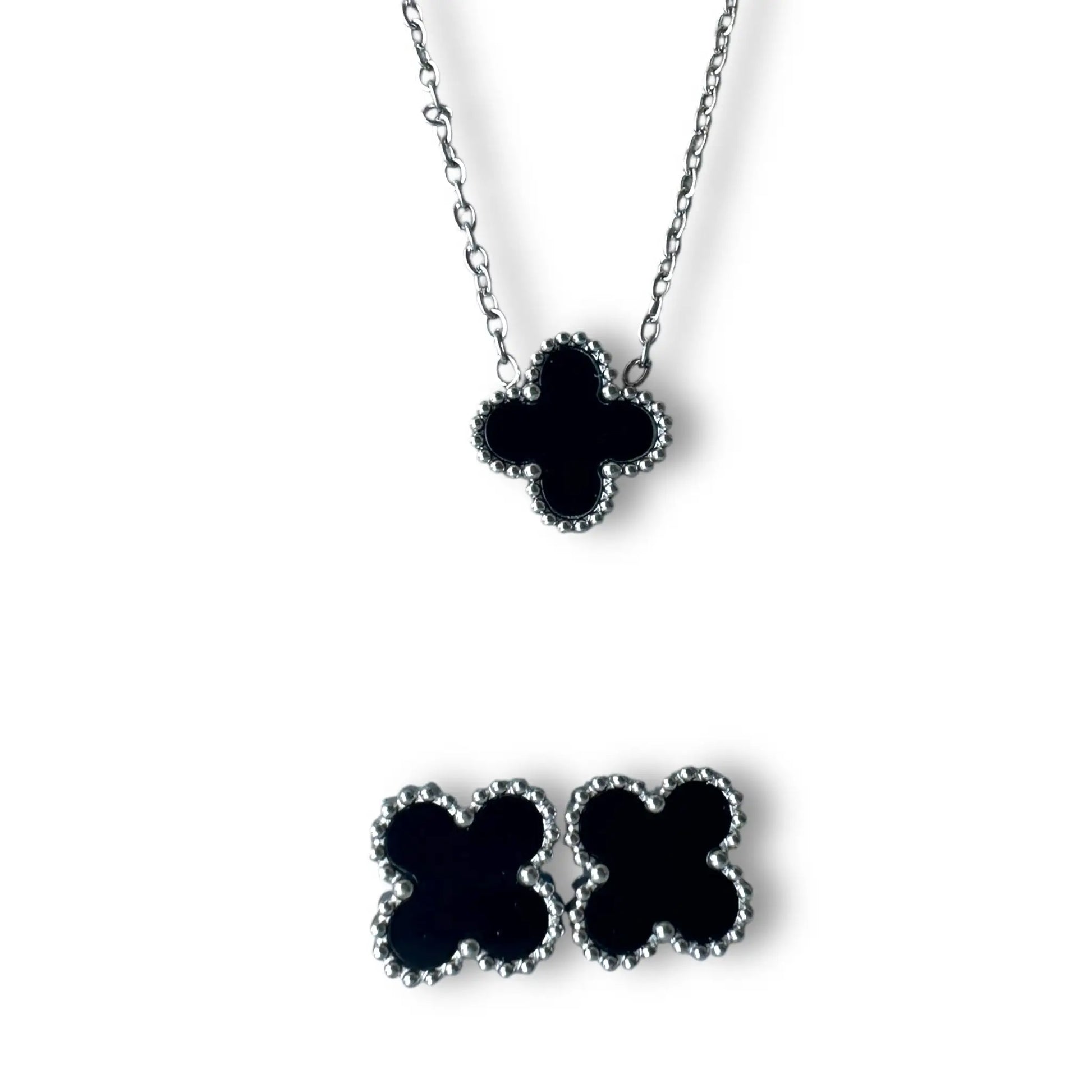Siyah Yonca Gümüş Set, sade ve zamansız tasarımıyla günlük kullanıma uygun bir aksesuardır. Minimal formu sayesinde farklı kombinlerle kolayca uyum sağlar ve dengeli bir görünüm sunar.